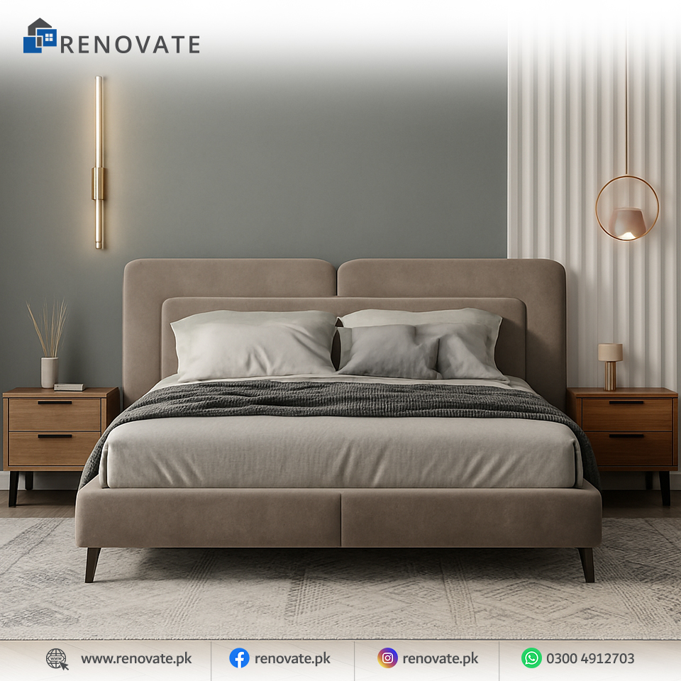 King sized full cushioned bed with side tables and dressing table with mirror along with 4 door cupboard and media wall with tv console. Made in MDF + deco paint as per requirement and tinted glass with aluminium frame. LED lights inside cupboard and LED vanity mirror