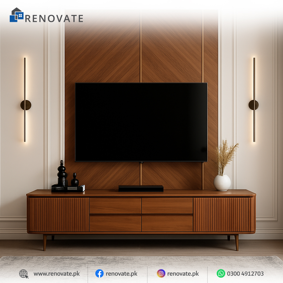 Media Wall + Console: 8ft length and 10ft height and 16 inches depth