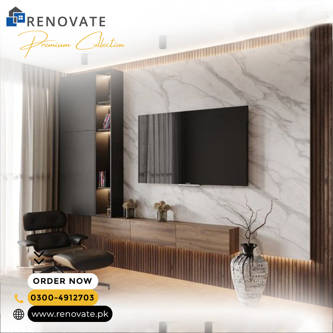 10ft length and 8ft height of media wall made in MDF + Super Gloss Sheet and PVC Panels.