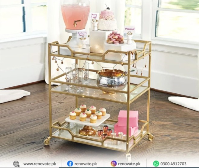 Tea trolley made in stainless steel gold plated frame and MDF shelves covered with PVC coating.