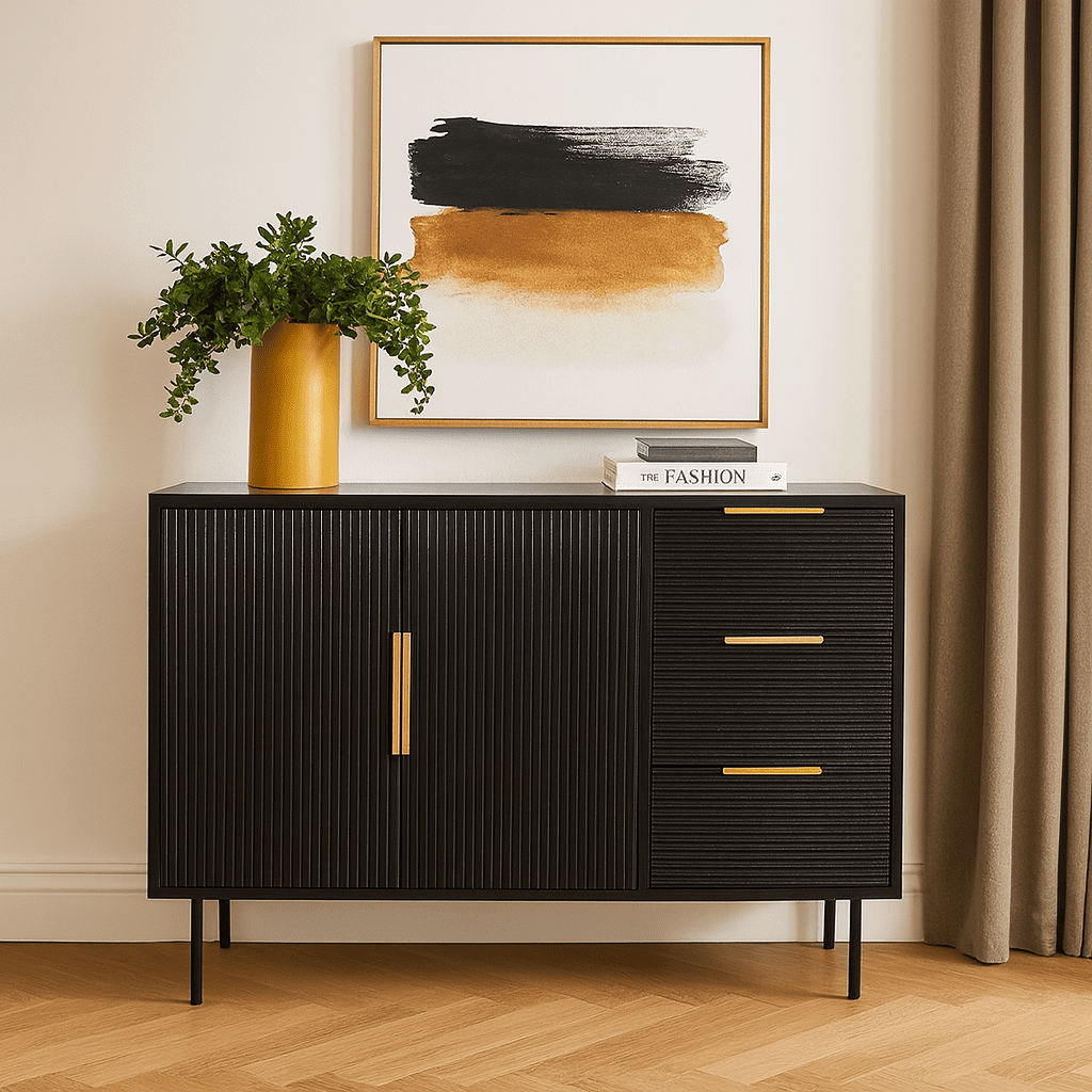 Sleek and modern black sideboard with gold handles, featuring two spacious cabinets and three smooth-glide drawers for versatile storage. Perfect for living rooms, dining areas, or offices, this elegant cabinet adds both style and functionality to your space.